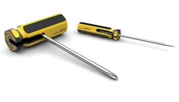 好的產(chǎn)品設(shè)計(jì),即能滿足人們?nèi)粘I钚枰材芄?jié)省材料,在大多數(shù)人的概念里,螺絲刀和小榔頭是兩種工具(上圖),設(shè)計(jì)師巧妙的發(fā)現(xiàn)人們的情感需求,將兩件工具合二為一。